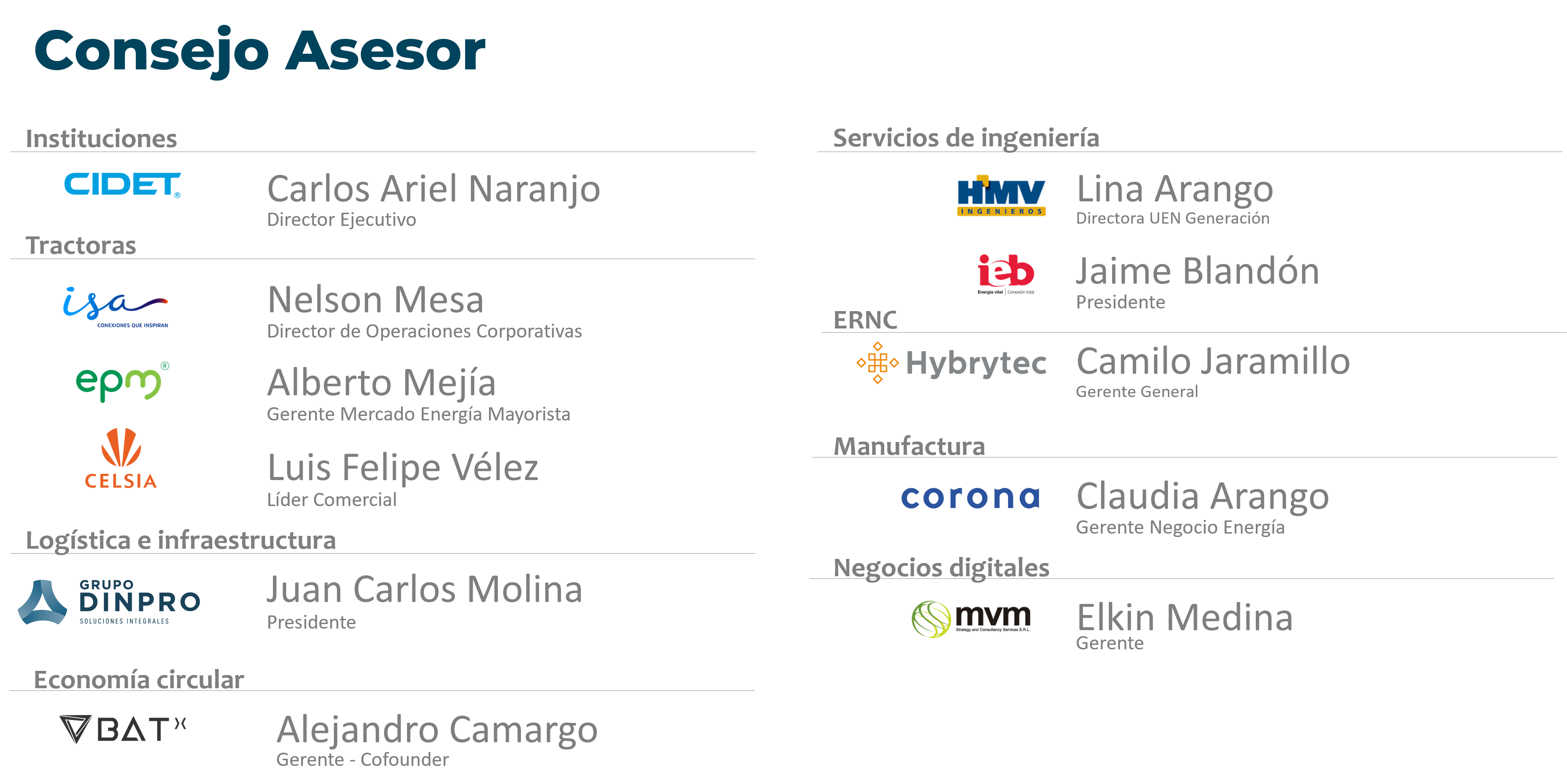 El Cluster cuenta con un Consejo asesor que es el encargado de direccionar la estrategia de trabajo identificando brechas y estructurando alternativas con el objetivo de desarrollar la industria. Está conformado por un grupo de compañías que representan los empresarios de la cadena de valor de la industria de la energía, a continuación sus integrantes: