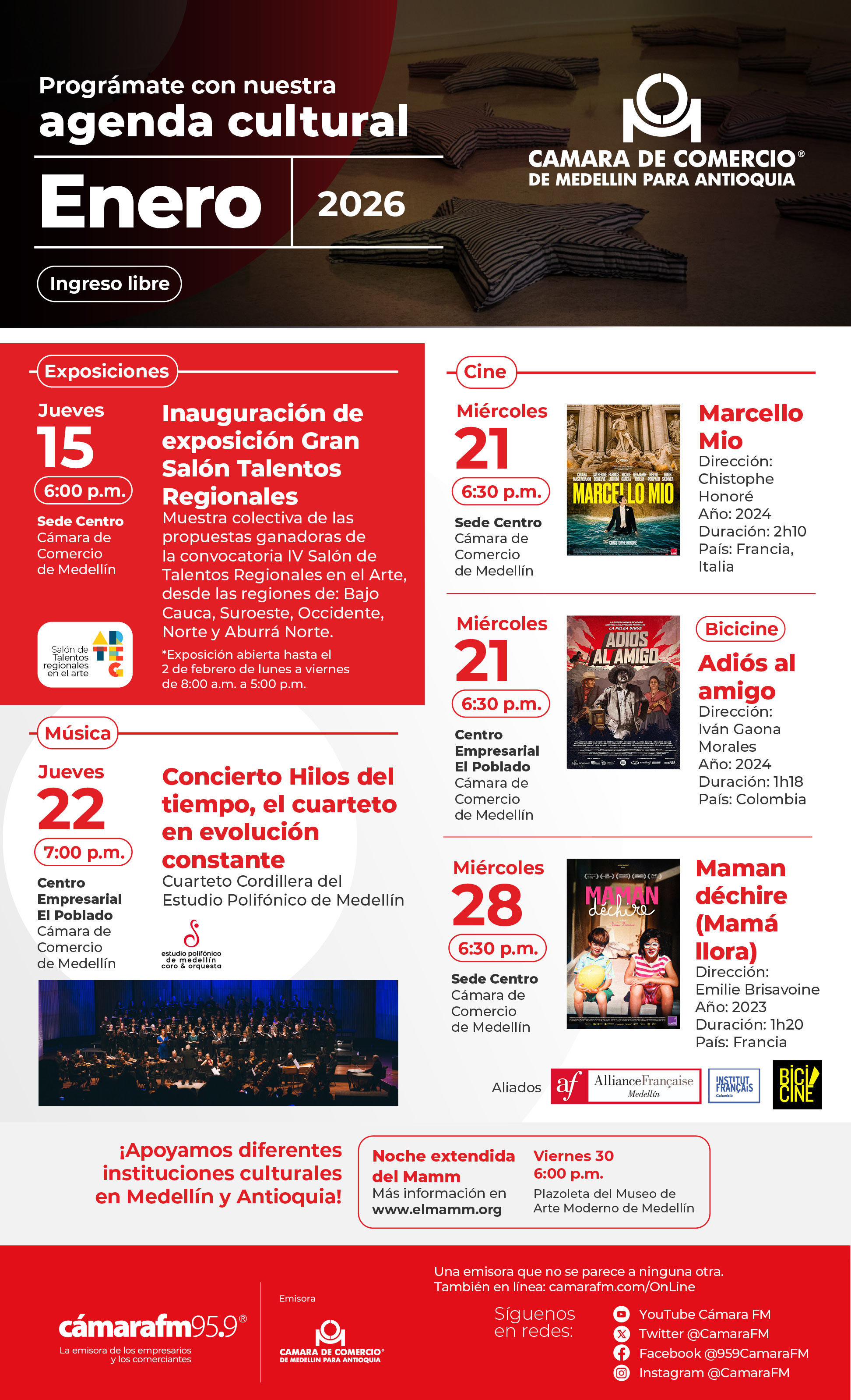 Conoce nuestros 3 frentes culturales y entérate de toda nuestra programación mensual. Cine, Arte y Música como opción de conocimienot y diversión