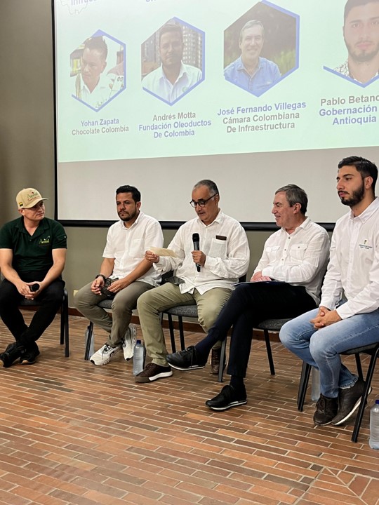 La jornada concluyó con un conversatorio en el que participaron Elmer Yohan Zapata, representante legal de Chocolate Colombia; Andrés Motta Jaramillo, de la Fundación Oleoductos de Colombia; José Fernando Villegas, de la Cámara Colombiana de Infraestructura; y Pablo Tomás Betancur, de la Gobernación de Antioquia. El espacio fue moderado por Carlos Mario Bernal, director del Cluster Hábitat Sostenible.