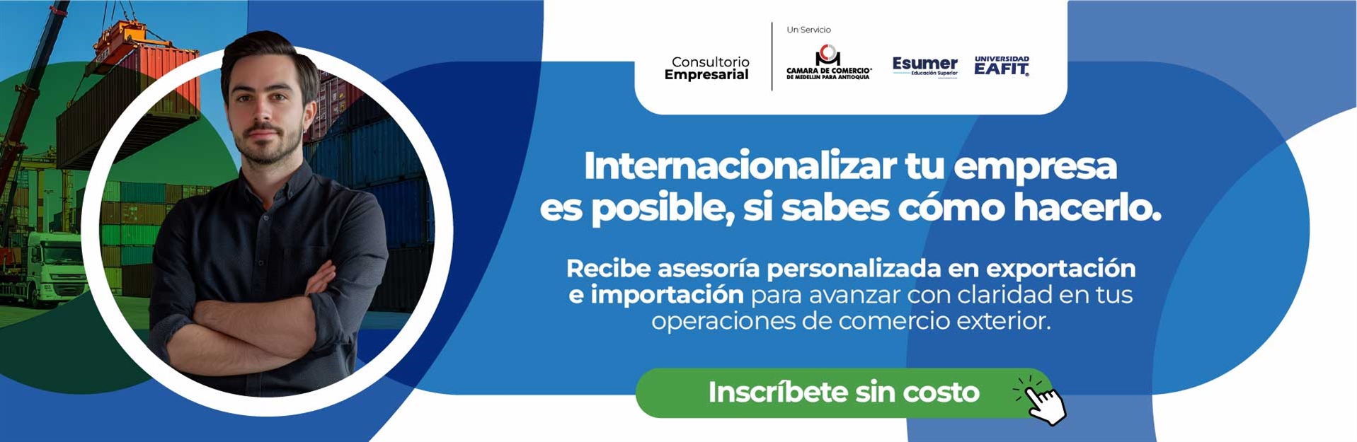 Los mercados internacionales ofrecen múltiples oportunidades para el crecimiento de tu negocio, y puedes encontrar las mejores herramientas para aprovecharlas, a través de los servicios de asesoría, programas de capacitación y acompañamiento que te ofrecemos en el Consultorio en Comercio Exterior, un servicio de la Cámara de Comercio de Medellín para Antioquia, la Universidad Eafit y la Institución Universitaria Esumer, en alianza con la Cámara de Comercio Colombo Americana y el apoyo del Grupo Antioquia Exporta Más.